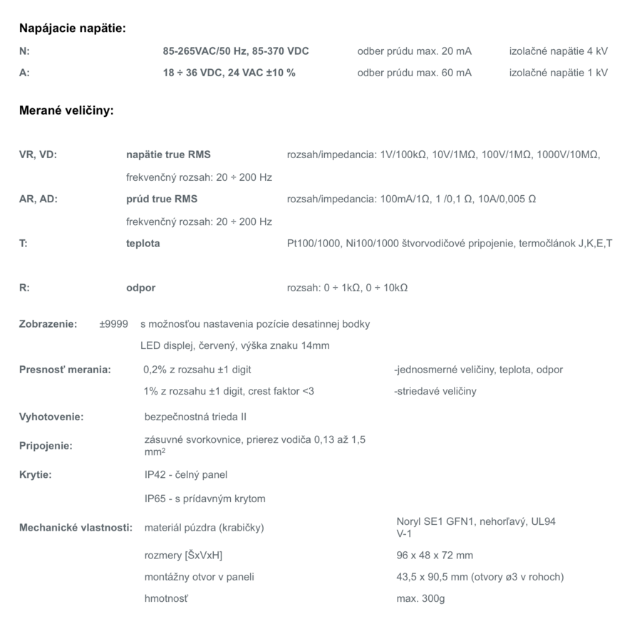 Zobrazovací rozsah je možné zmeniť podľa potreby zákazníka. Napájanie a meraný signál sa pripájajú pomocou zásuvných svorkovníc v zadnej časti prístroja.